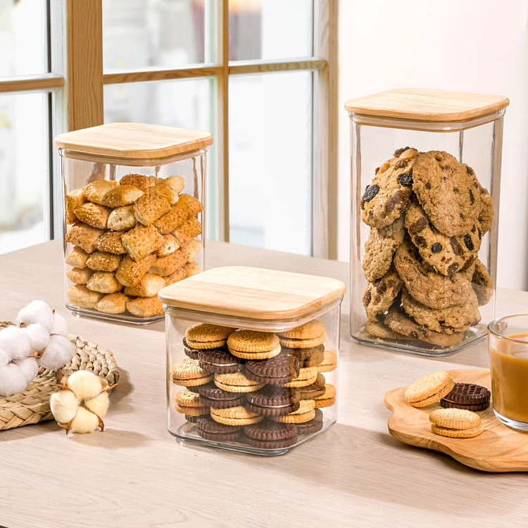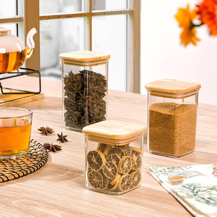 بانکه مربع با درب چوبی برای نگهداری ادویه. مناسب برای استفاده در آشپزخانه.