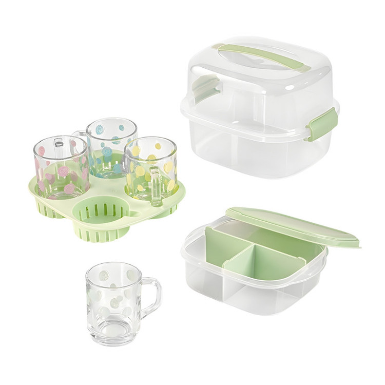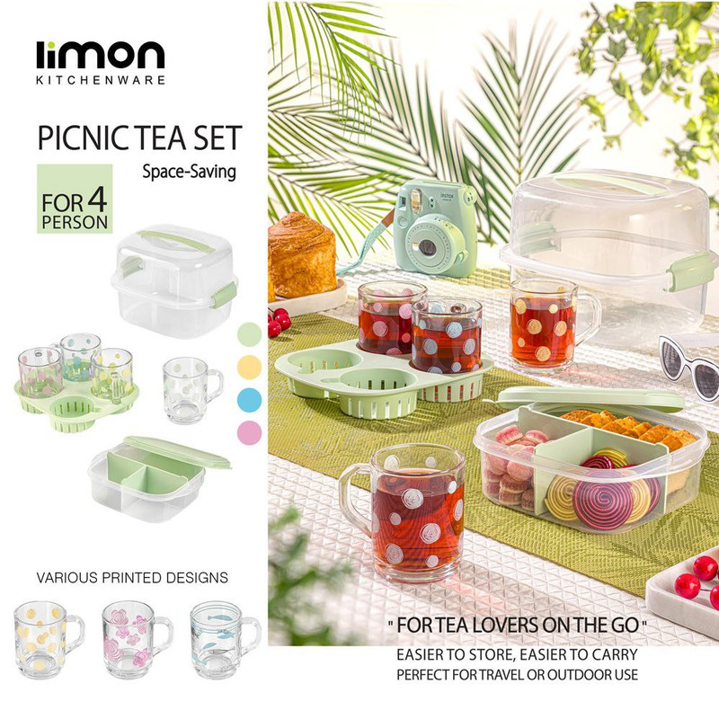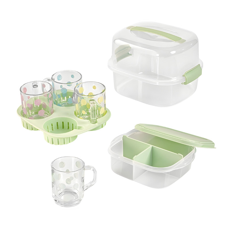 ست چایخوری 4 نفره مسافرتی لیمون 2441: شامل :4 عدد لیوان، 1 عدد سینی مخصوص، 1 عدد ظرف 3 قسمتی جهت قراردادن قند و چای غیره// طرح روی لیوان های خالخالی است.