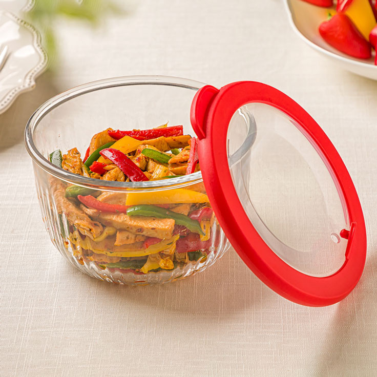 کاسه گرد شیار دار لیمون، جنس کاسه این محصول از شیشه و درب آن پلاستیکی است. این محصول دارای گنجایش 470 میلی لیتر بوده و مناسب نگهداری مواد غذایی در یخچال و استفاده در مایکروویو می باشد.
